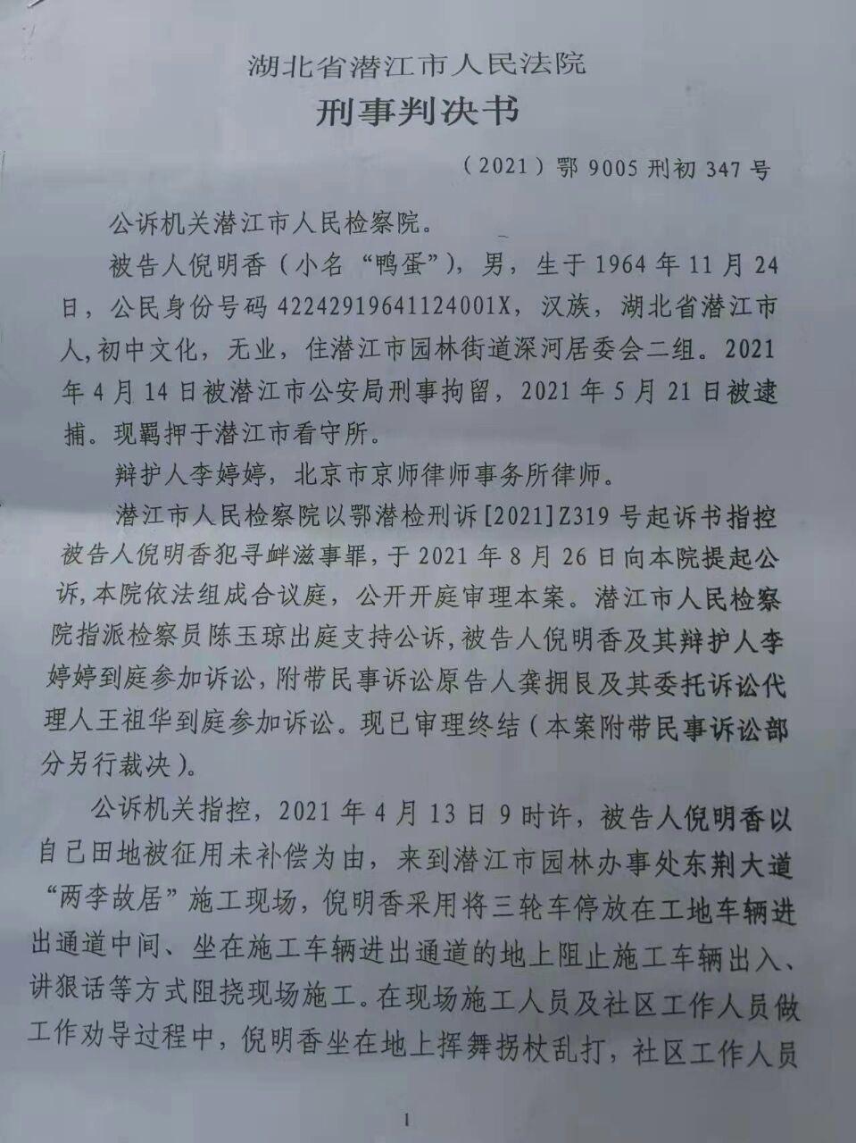 【民生观察2021年12月4日消息】湖北省潜江市人民法院为确保年底案件清零,竟然开庭两天后火箭式下达判决书,判决访民倪明香故意伤害罪两年半,湖北省潜江市人民法院故意制造冤假错案。