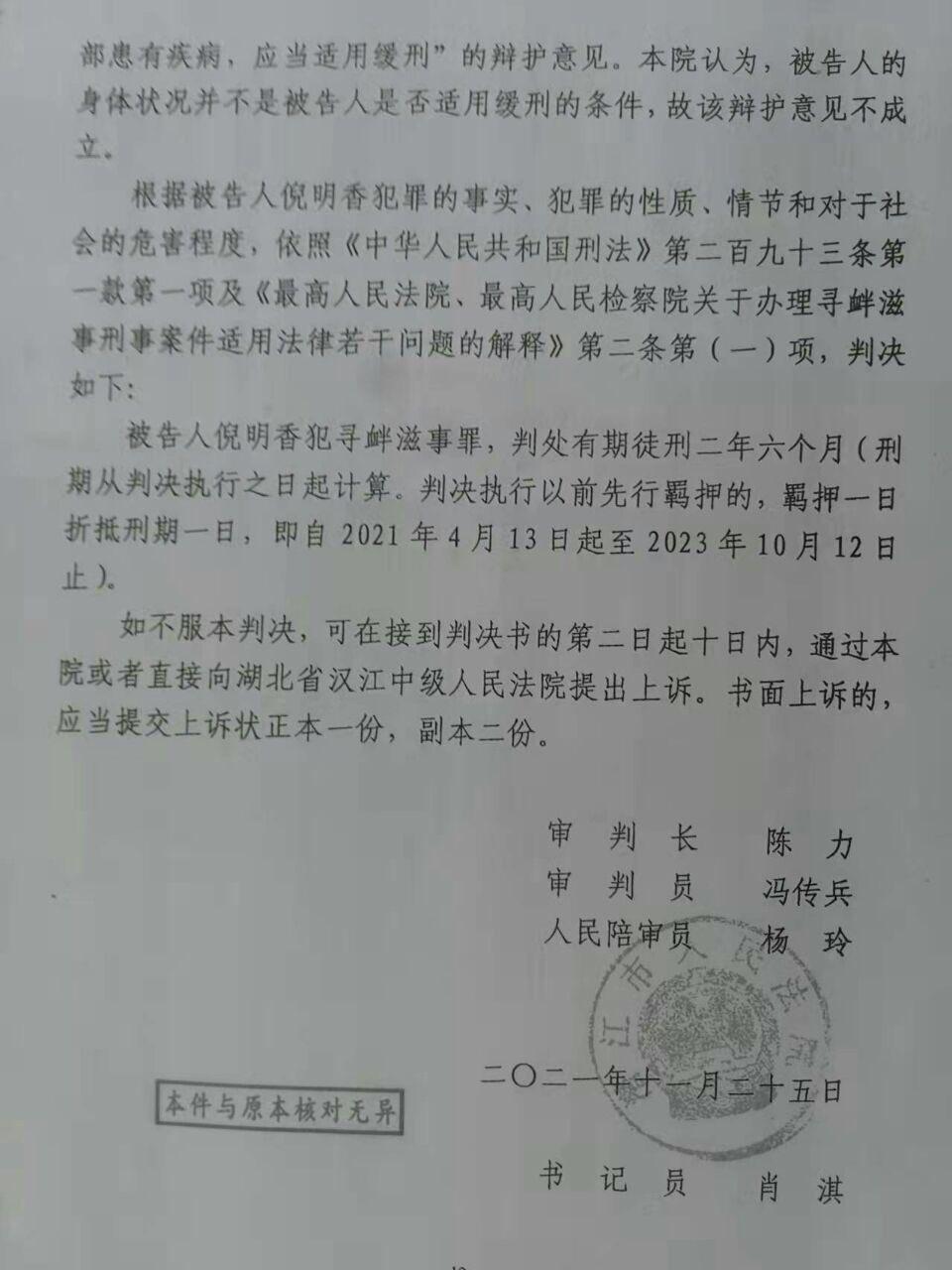 接到判决书后倪明香不服本判决,倪明香代理律师提出了上诉,估计湖北汉江中级仙桃人民法院也会火速下达结果的。希望湖北汉江中级法院改判倪明香无罪释放回家。