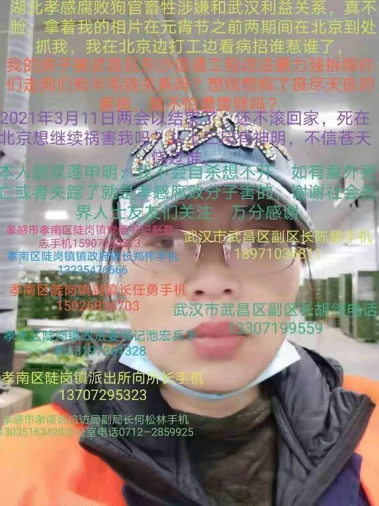 据悉,胡双莲因房子被武汉市武昌区东沙湖连通工程非法暴力强拆,至今12年没安置没补偿。在北京上访长期遭到户籍地孝感市的腐败分子打击报复,2017年以莫须有的罪名被判刑18个月,共被行政拘留10次,其中在北京被行政拘留3次。