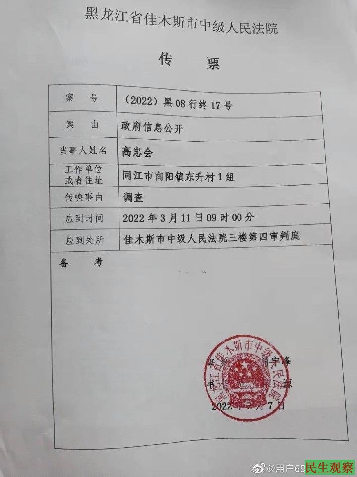 【民生观察2022年3月14日消息】黑龙江省同江市向阳镇东升村维权人高忠会,因不服同江市水务局违法强淹他家农田事件申请信息公开,该案于2022年3月11日上午,在黑龙江佳木斯中级人民法院开庭审理。然开庭后,被上诉人同江市水务局却没有依法到庭,上诉人提出多项请求却遭法院违法多次拒绝。