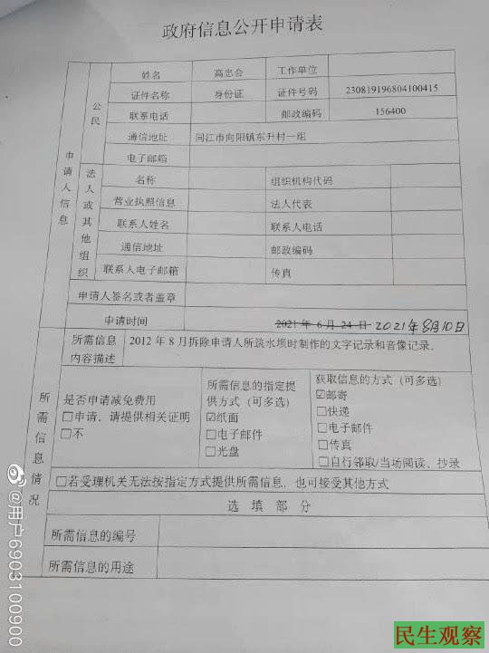 黑龙江省同江市向阳镇东升村维权人高忠会,因不服同江市水务局违法强淹他家农田的事件申请信息公开。
