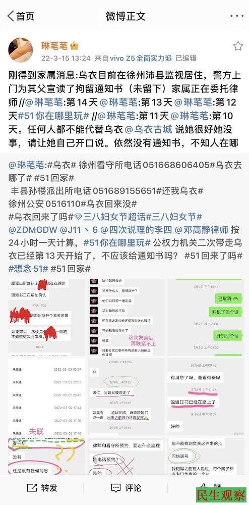 3月15日,是乌衣失联的第14天。网友琳芼芼自称与乌衣的妹妹联系上了,乌衣现在徐州沛县被监视居住,警方已上门为其父宣读了拘留通知书。警方说,纸质通知书已经在路上了。