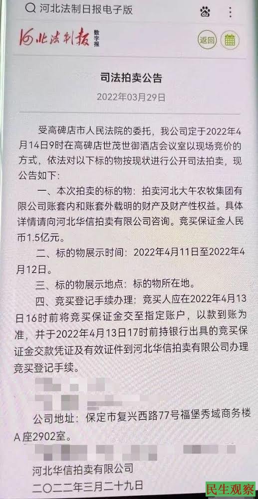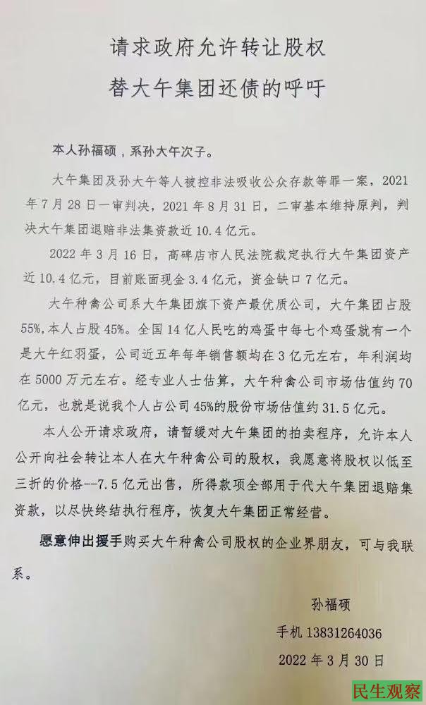 【民生观察2022年3月31日消息】2022年3月28日,孙大午亲属发布一则《关于大午集团公司面临被整体拍卖的声明》,引发广大网友评论。3月30日,孙大午次子孙福硕发布呼吁令事件进一步发酵。孙福硕表示,自愿以7.5亿元的低价抛售大午种禽公司45%的股份,以避免大午集团公司被贱卖,以求尽快终结执行程序,恢复大午集团的正常经营。据悉,大午集团将于2022年4月11日被司法拍卖。