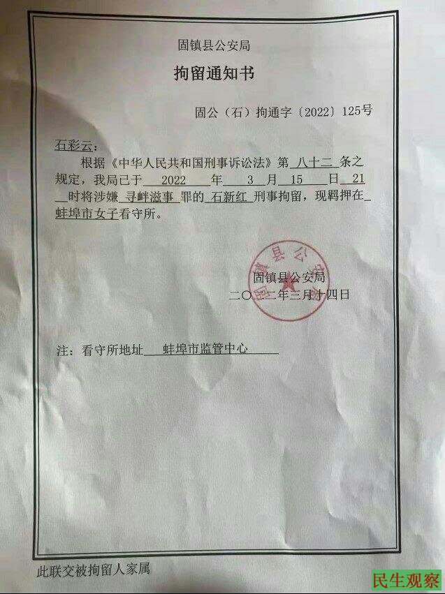 石新红在3月14日被当局在北京非法绑架遣返抓回当地后,3月15日被非法构陷寻衅滋事关押在当地蚌埠市女子看守所,这是当局蚌埠市公安局出具的法律文书依据,随后当局在此出局延期关押法律手续为,关押时间为改于2022年3月18日至2022年4月14日。两份法律手续相隔三天时间后改为延期拘押在蚌埠市女子看守所。