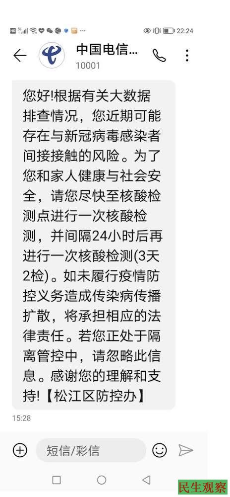 【民生观察2022年9月15日消息】因上海市松江区佘山镇出现一例阳性,佘山镇政府便发布通告要求上万人连续三天全员核酸检测,上海公民宋嘉鸿质疑政府此行为涉及滥用职权,第二天手机便收到松江区防控办的短信威胁。