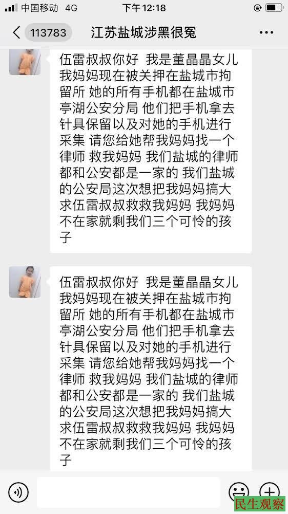 今天,董晶晶大女儿给伍雷律师发出如下消息:伍雷叔叔,你好。我是董晶晶女儿,我妈妈现在被关押在盐城市拘留所,她的所有手机都在盐城市亭湖公安分局,他们把手机拿去证据保留,以及对她的手机进行采集。请您帮我妈妈找一个律师救我妈妈。我们盐城的律师和公安都是一家的,我们盐城的公安局这次想把我妈妈的事搞大。求伍雷叔叔救救我妈妈,我妈妈不在家,就剩我们三个可怜的孩子。