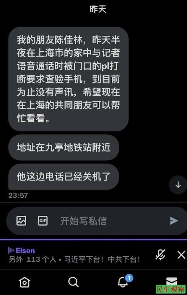 4、紧急关注上海女孩陈佳林。因连续在乌鲁木齐中路参加悼念活动,在回到九亭地铁附近家中正接受媒体采访时,被隶属于上海市城市轨道和交通分局钱姓民警(电话:18018808492)抓走,具体抓走时间不详。据透露,11月29日晚上十点,被关押在上海市第二看守所(莫高路9号)。陈佳林身患抑郁症,请全网去电关注。