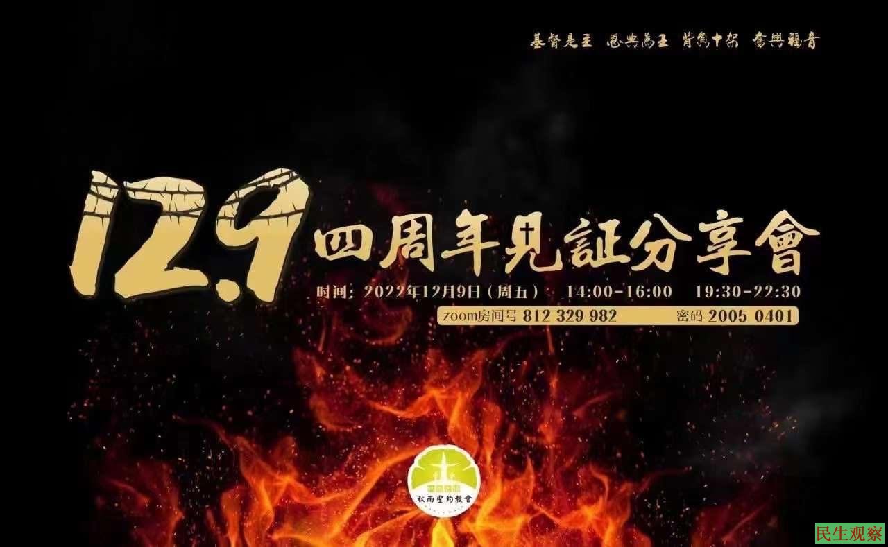 会友土豆妈(方鸿)发消息说:“今天是12.9教案四周年纪念日,下午的见证分享会已经顺利举行,有超过一千人在线参加了见证会。晚上7:30-10:30我们会继续见证神在我们中间的恩惠。欢迎转发及参加。”
