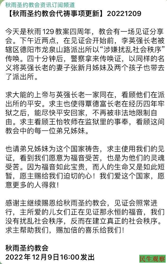 【民生观察2022年12月10日消息】2022年12月9日,是成都秋雨圣约教会12.9教案四周年纪念日,下午教会有一场见证分享会。在见证会开始前,李英强长老、李英强长老的妻子张新月及孩子、覃德富长老、戴志超传道等人均被辖区派出所传唤。目前,除戴志超传道以外,其他人都已获释。