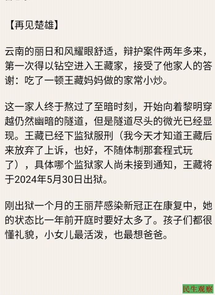 据张磊律师消息,王藏已经下监狱服刑(今天才知道王藏后来放弃了上诉,也好,不随体制那套程式玩了),具体哪个监狱家人尚未接到通知,王藏将于2024年5月30日出狱。