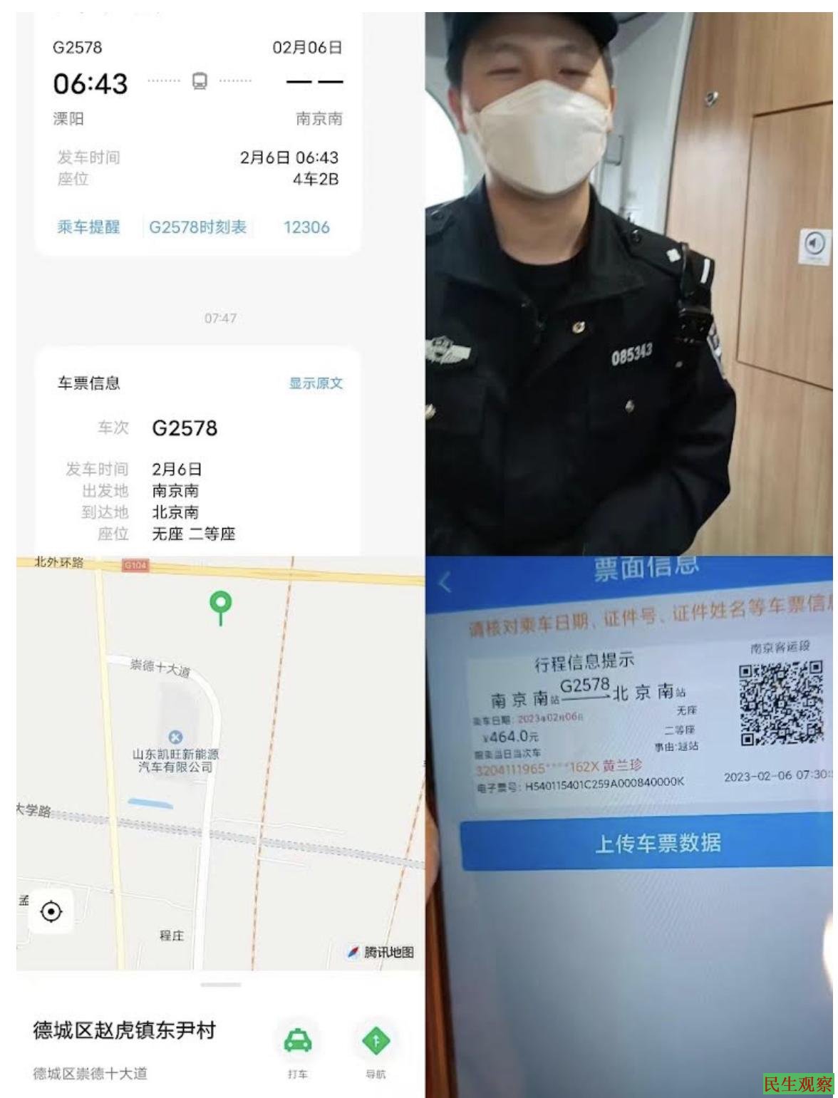 【民生观察2023年2月6日消息】2023年2月6日,江苏省常州市钟楼区维权人士黄兰珍,乘坐南京开往北京的高铁,在车上一自称是南京铁路公安局的警察检查了黄兰珍的身份证和车票,要黄兰珍配合,欲将她交接给不知道是哪里的警察。