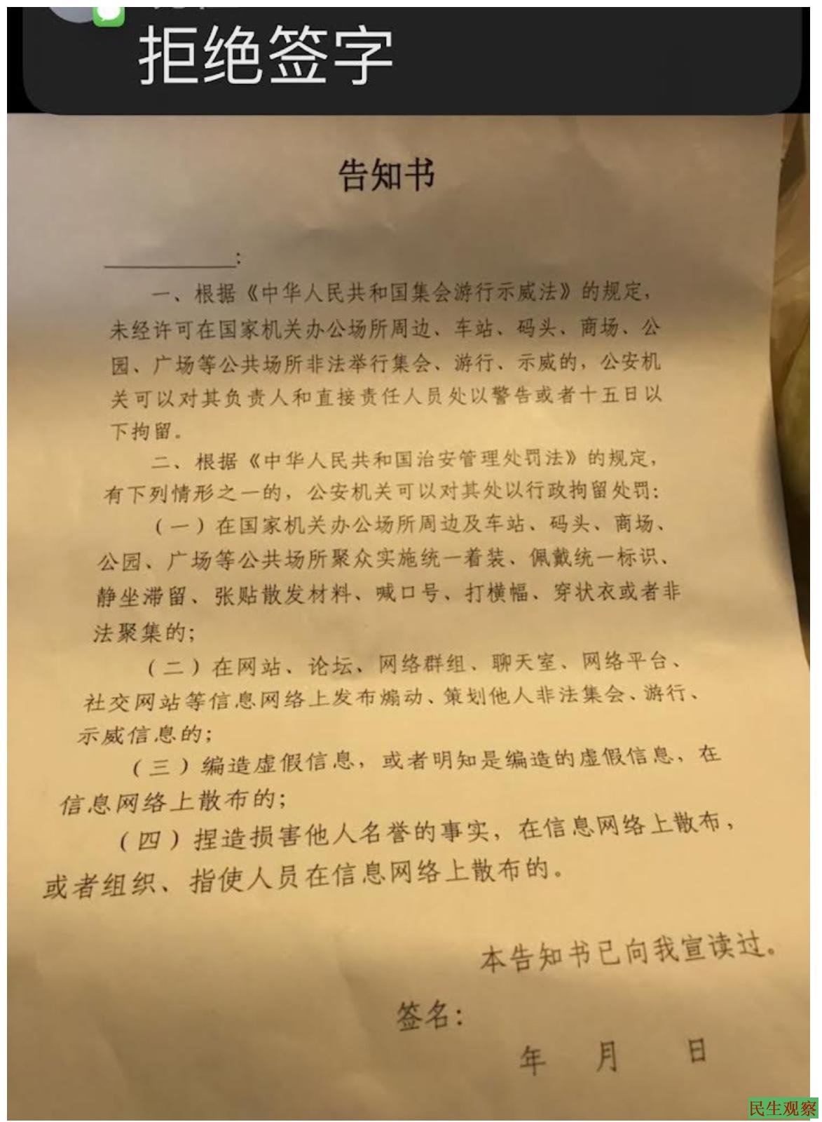 另外,有武汉市民反映,警方对在抗议现场被人脸识别的老人全部要求签订书面《告知书》,防止老人们再次上街聚集维权。