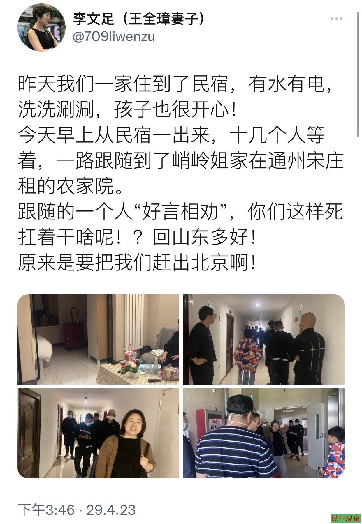 4月28日,王全璋一家住到了民宿,有水有电,洗洗涮涮,孩子也很开心!29日早上,一家人从民宿一出来,门口十几个人等着,一路跟随到了王峭岭在通州宋庄租的农家院里。跟随的一个人“好言相劝”:你们这样死扛着干啥呢!回山东多好!李文足表示,原来是要把他们一家赶出北京啊!