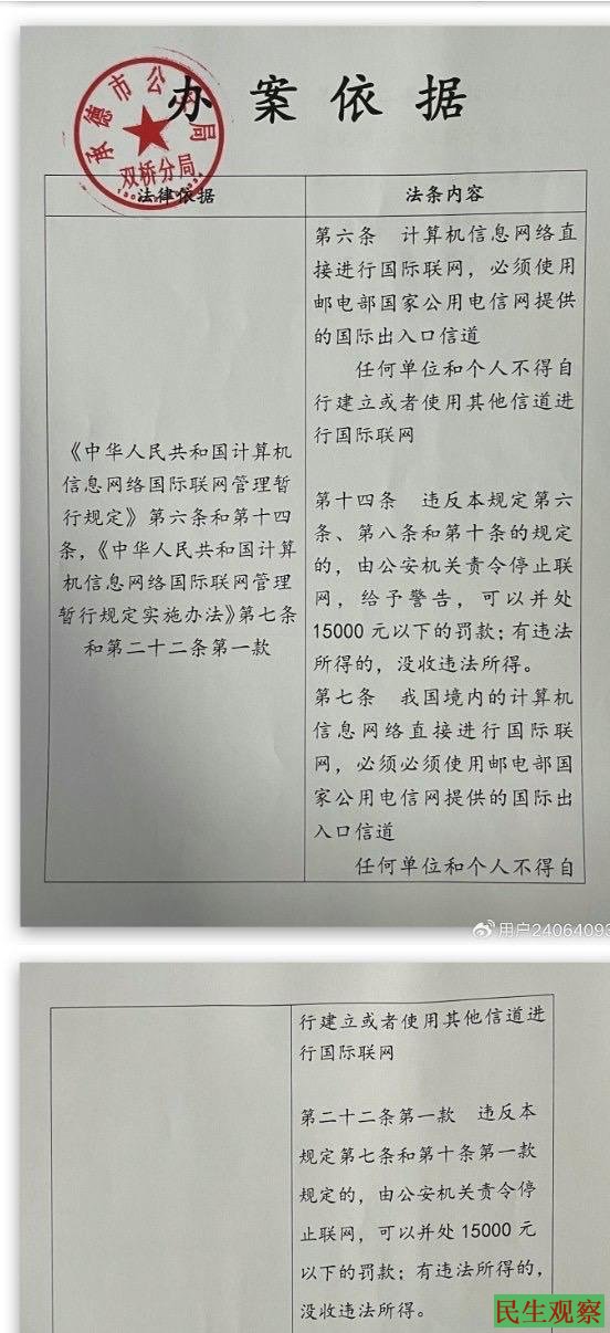 我们了解到,承德市公安局双桥分局的办案依据是,《中华人民共和国计算机信息网络国际联网管理暂行规定》第六条和第十四条、《中华人民共和国计算机信息网络国际联网管理暂行规定实施办法》第七条和第二十二条第一款之规定,具体内容如下: