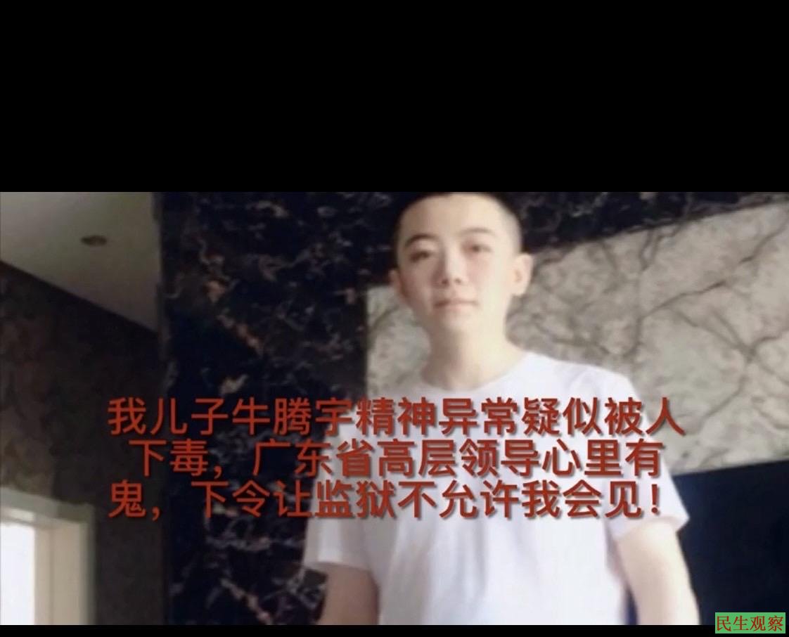 【民生观察2023年12月11日消息】近日,牛腾宇在广东四会监狱疑似被国安人员投毒,并出现精神异常。2023年12月7日,牛腾宇母亲前往四会监狱要求会见牛腾宇,被广东高层下令阻挠、特警持枪恐吓、禁止她在四会监狱会见牛腾宇。因念子心切,牛母病倒。目前,牛母已从四会来到广州,其向广州监狱管理局反应了情况。目前,牛母在下榻的酒店被多人跟踪监视,她亦在酒店等待回复。