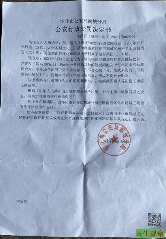 据怀化市公安局鹤城分局公安行政处罚决定书显示,2024年6月3日,违法行为人唐浩铭通过翻墙软件登录推特(现为X)软件,并转发了网名为PhilipFan的一条时长7秒的短视频,配文“每年纪念活动我都会来,今年还帮忙当个义工做航拍。我不喜欢喊口号,来就来实的,不整虚头巴脑的!”,视频内容有损党和国家形象,造成不良社会影响。
