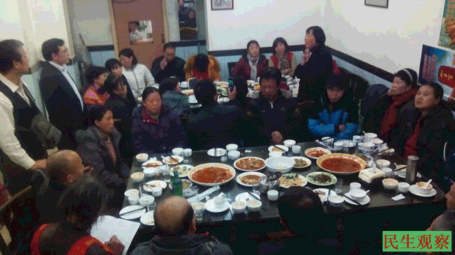 民生观察工作室2013-12-29消息:昨晚17点30分,全国各地在京维权公民2013年最后一次公民“同城饭醉” 聚餐活动,在北京朝阳区某饭店举行,此次同城聚餐有维权人士和众多访民参加:有北京著名维权人士胡佳、李英之和江西彭中林、朱菊如、辽宁袁文华、张桂荣、上海吴玉芬、郑培培、王永风、江苏于艳华、冯红伟、吉林李秋伟、广西韦亚妮、湖北徐彩虹、天津陈刚、郑建会、大连盛兰福等45人,此次在京公民“同城聚餐”也有几名90后、80后的在校学生及刚参加工作的公民参加。 大家畅所欲言,每人各自介绍和发表观点看法,并发生了激烈的争辩、讨论,最后统一观点和认识,大家要团结一致,推动和尽早实现中国的法治、民主进程及社会的改革改制,以及组成松散的“维权互助团”。