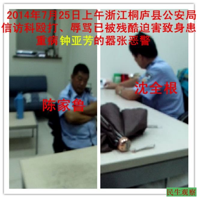 民生观察工作室2014-7-29按:浙江维权上访人、被精神病者钟亚芳三年来一直遭到浙江桐庐县当局指派的多名人员的严密监控制,为此她向桐庐县当局提出撤消监控人员的要求。2014年7月25日,钟亚芳就这一诉求到桐庐县公安局信访科要答复,谁知因拍照遭到警察陈家鲁、沈全根的殴打,下面是根据当时的全程录音整理的文字和图片。