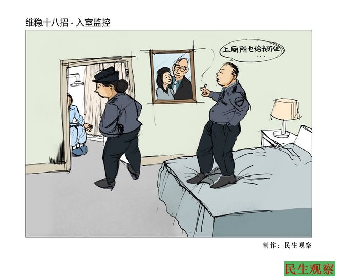 所谓“入室监控”,是指国保或其它人员进入被维稳人员的家中进行无隙监控,甚至吃喝拉撒睡都在房中,以保证被维稳人员片刻不能脱离监控视线。本次漫画并非夸张,而是就发生在我们身边的故事。