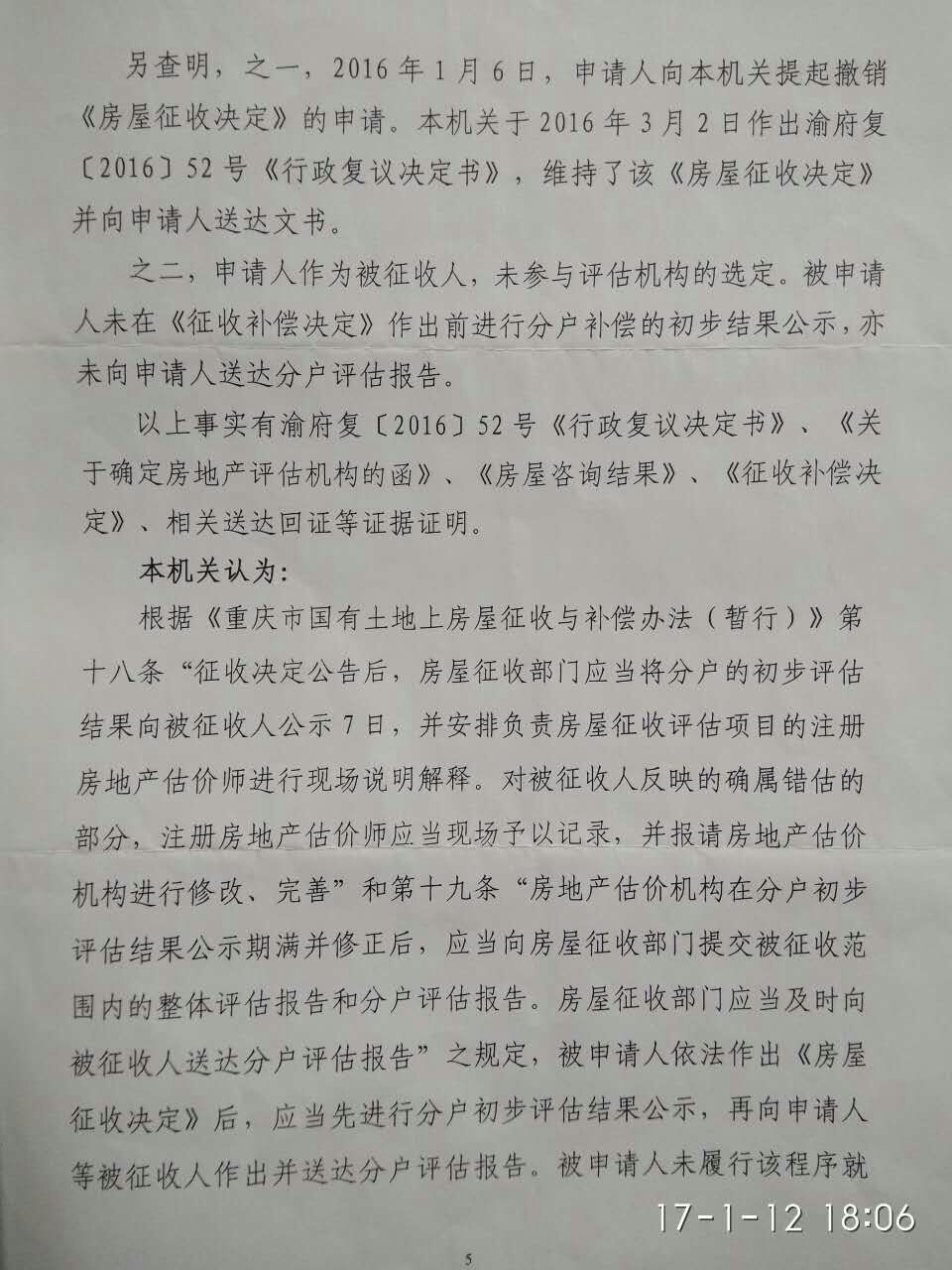 杨先玉的家人说:“强拆是九龙坡区政府决定的,在强拆之前,九龙坡区政府并没有履行相关公告和告知等程序,只出具了一份拆迁补偿决定书,并把我家好好的房子鉴定为危房。我一家不服补偿决定向重庆市政府提出复议,重庆市政府审查后认为,九龙坡区政府没有履行相关程序,撤销了区政府作出的补偿决定,责令区政府重新作出具体行政行为。但九龙坡区政府又给了一份同样的补偿决定,我们再次提起复议,复议决定还没出来便强拆了我们的房子。我向所有政府部门反映了此事,现在重庆市九龙坡区政府正在对九龙坡区房管局进行调查。”