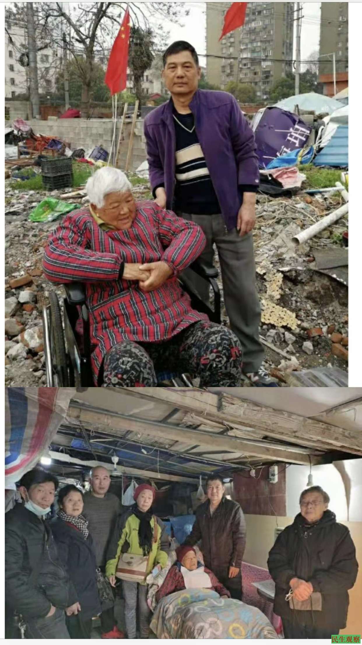 杨先生说:“年过九旬的李兰香老人非常坚定且乐观,当我们来到这摇摇欲坠的拆迁棚子时,真是既担心又震撼,老人的儿女们照顾母亲一丝不苟,体贴入微,母亲躺在病榻上,目光坚定沉着,虽不时痛苦呻吟,但仍面露微笑向我们招呼!”