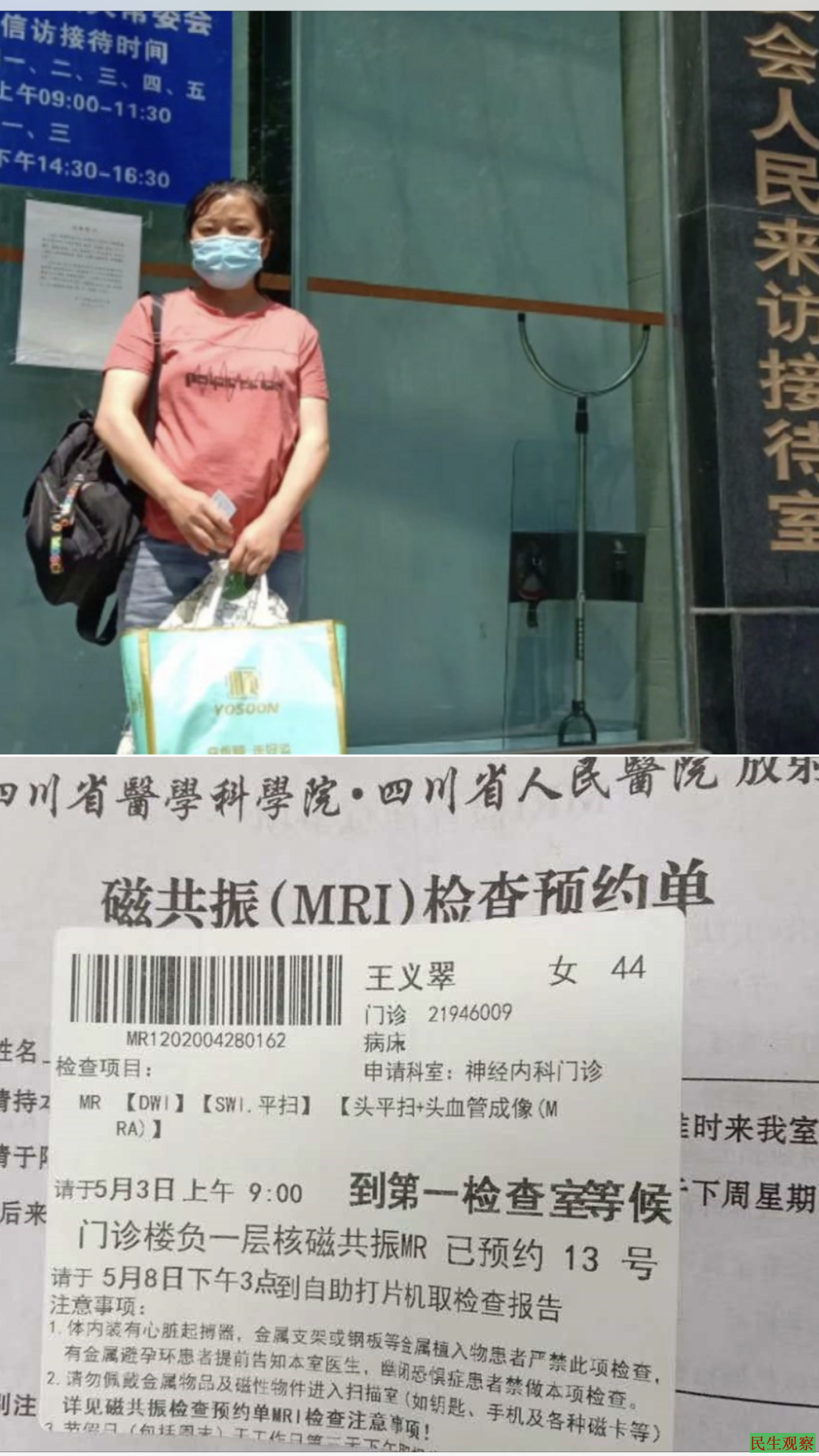 2020年5月10号,在四川省第一医院检查结束,因身体不好体力不支,在地铁口休息时刻,突然来一群不认识的人,将王义翠团团包围,以查验身份证为借口鉴定为上访人员,不由分说交给户籍所在地内江市政府工作人员。