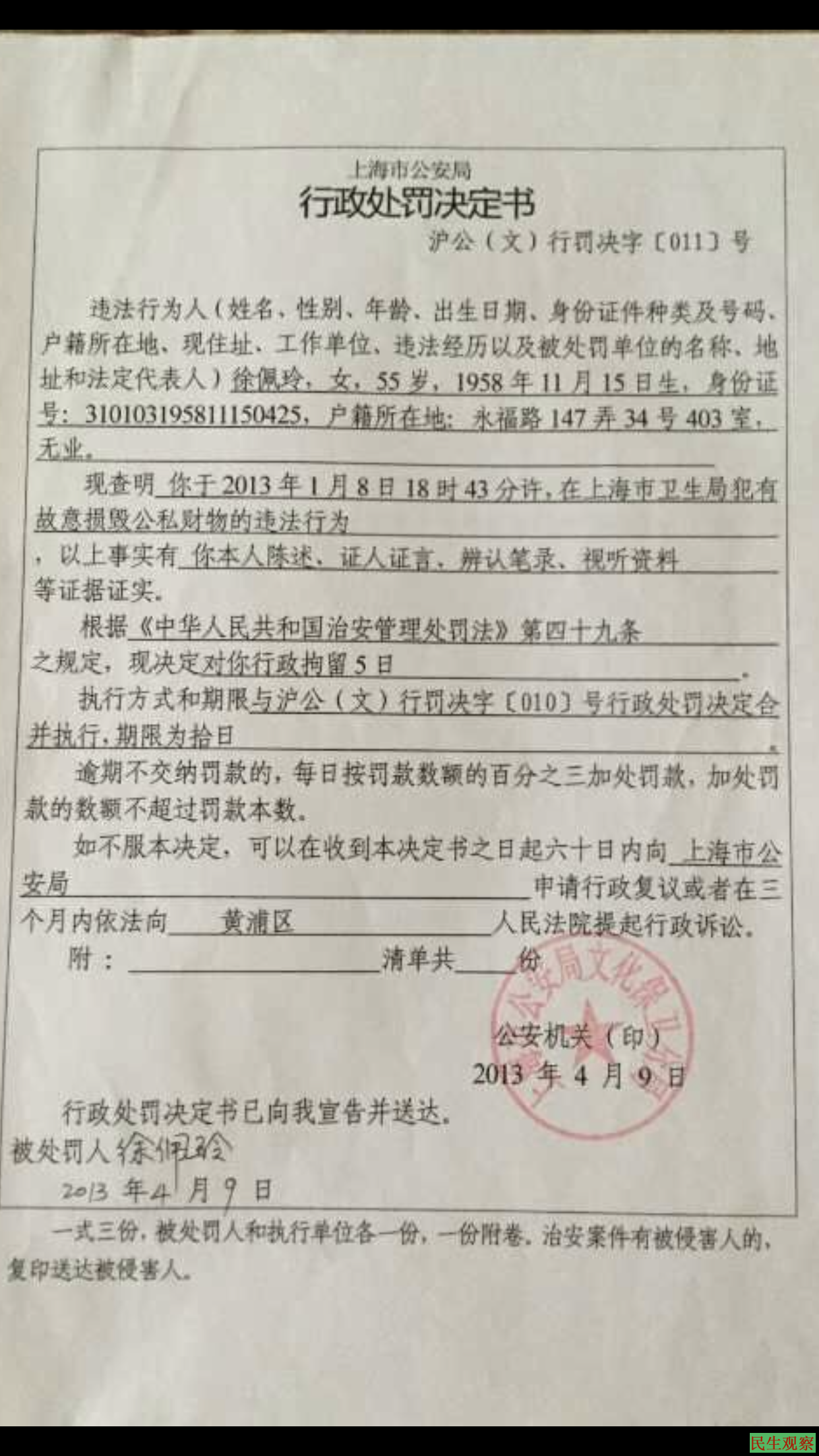 2013年4月在上海市卫生局以故意损毁公私财物和扰乱单位秩序被上海公安局文化保卫分局处行政拘留10天;