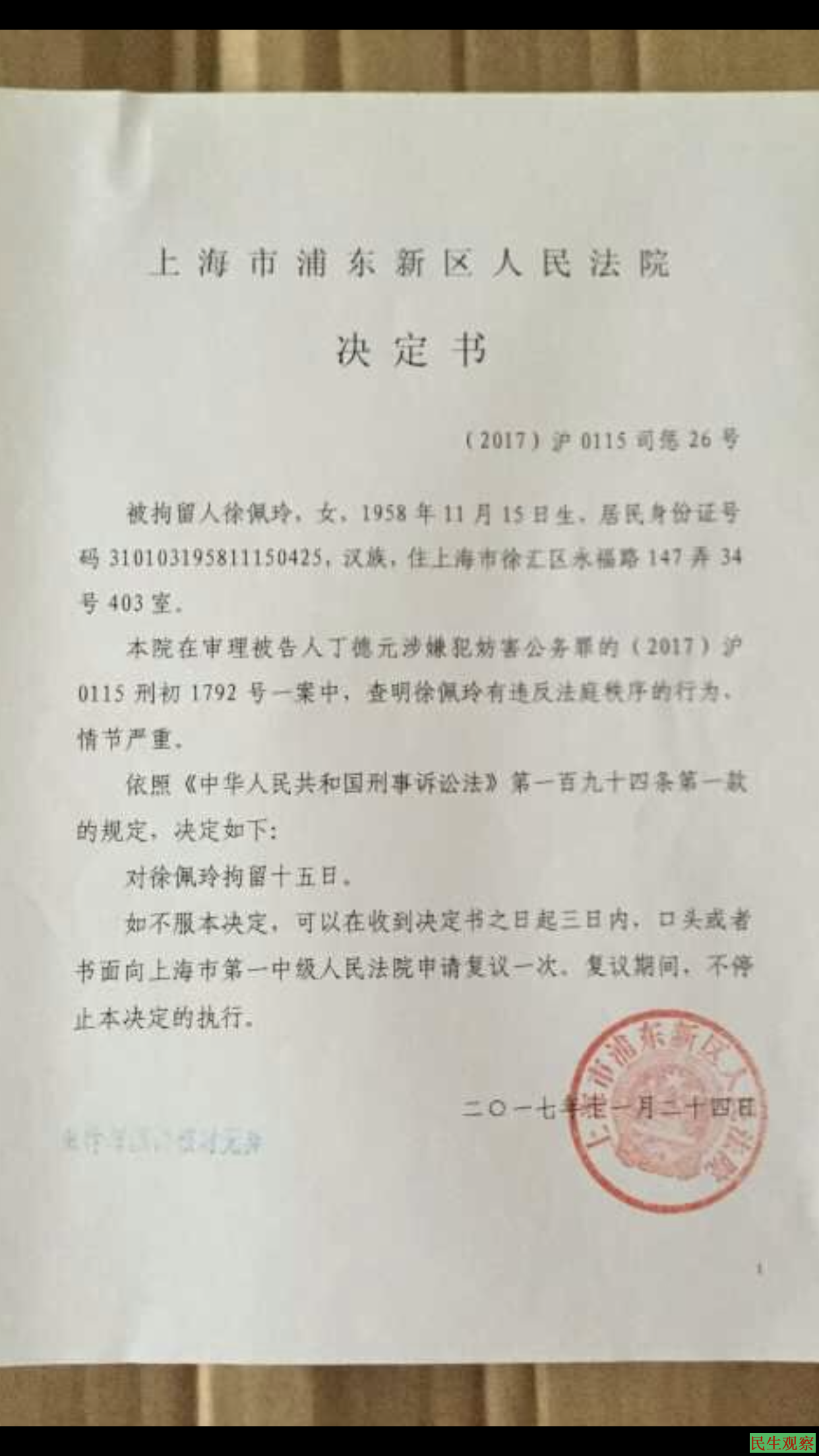 2017年11月被上海浦东新区人民法院拘留15天。