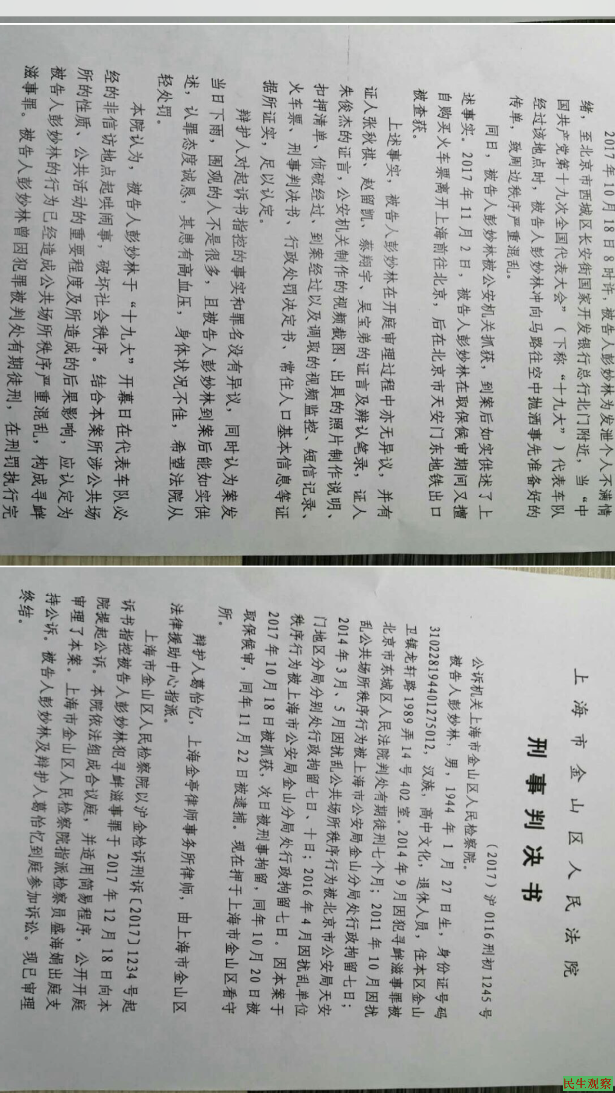 2017年11月因犯寻衅滋事罪被上海市金山区人民检察院判处有期徒刑一年六个月。