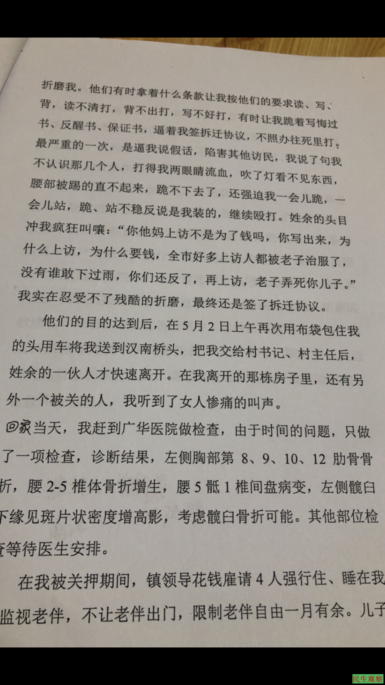 在非法关押期间逼曾祥军跪在地上写保证书,悔过书逼着签字同意坼迁协议,不依照他们的规定跪好,写好保证书就打,还逼着曾祥军说假话,让曾祥军陷害其他访民,曾祥军说:我真不认识那几个访民,随后被打的双眼流血,腰部被踢的无法站立,也跪不稳了,叫余总的人说曾祥军伪装的,故意让曾祥军一会站一会跪,无论是跪或者是站,这些残暴不仁的爆头认为不满意就对曾祥军一顿暴打,并且狂言叫嚷:你***不就是要钱吗?你写出来,老子治过很多像你这样的人,这个叫余总的人直接说:是政府部门特意安排老子治你们的,没有任何一个敢下过雨,再上访老子弄死你儿子。