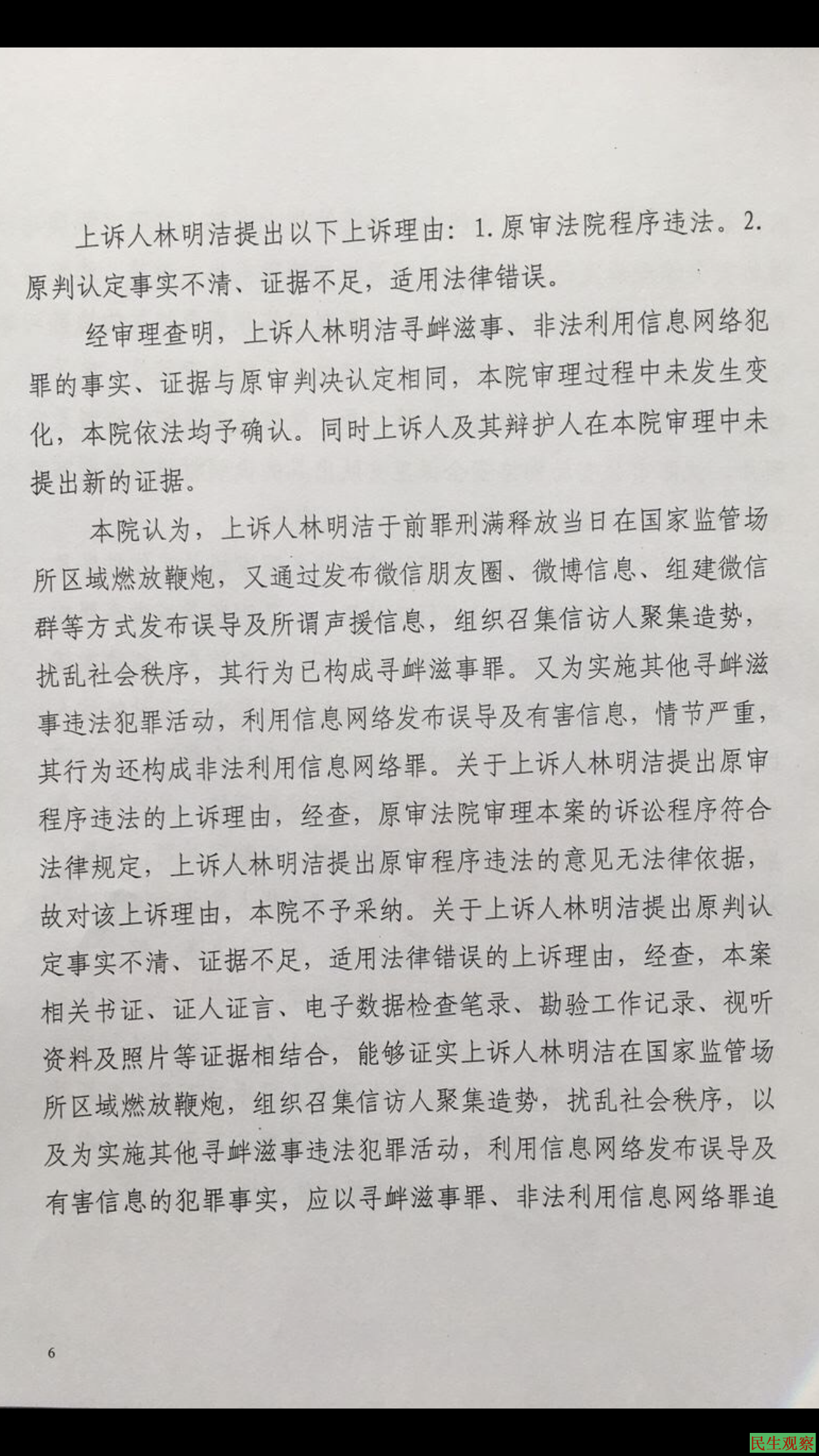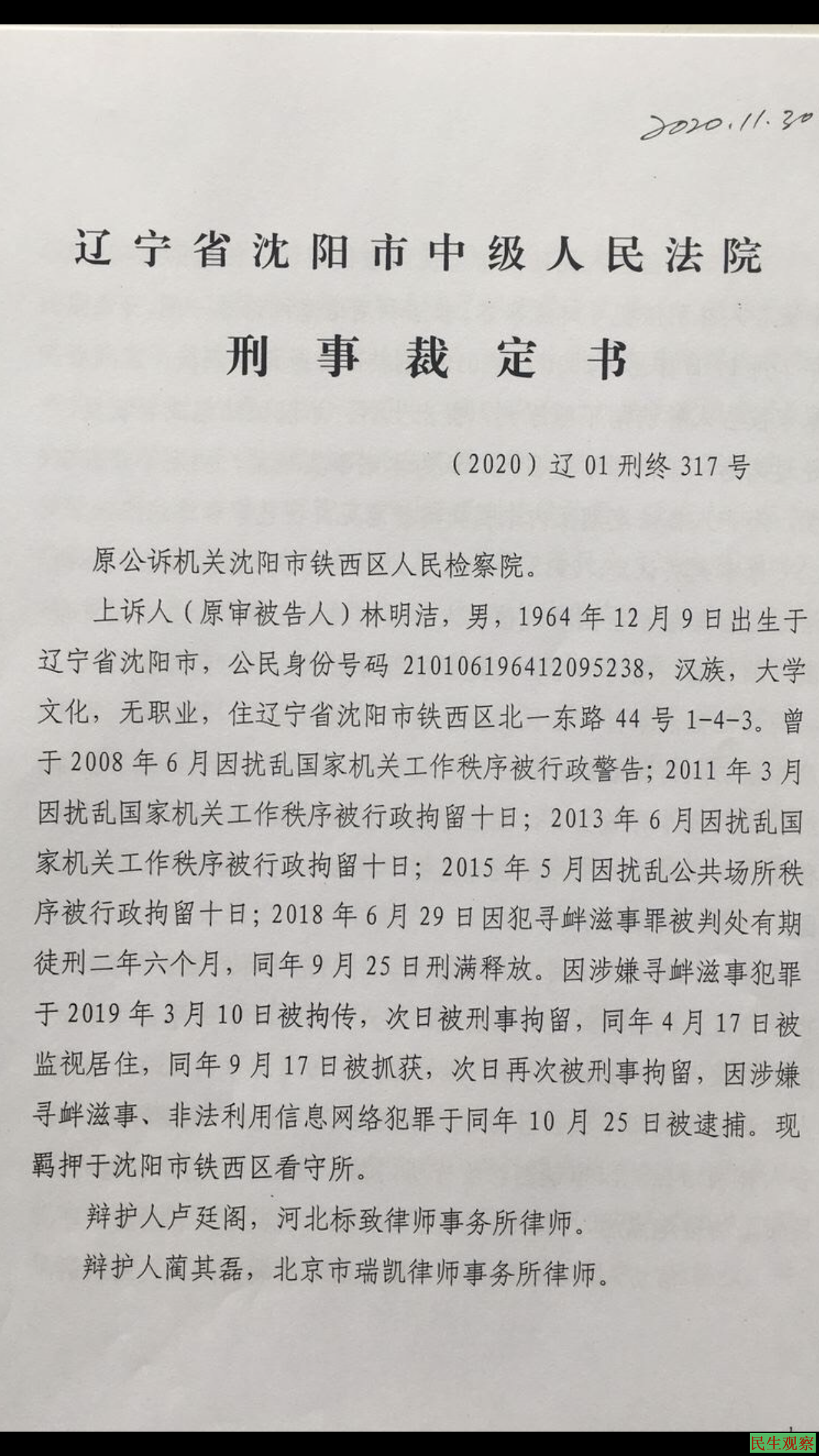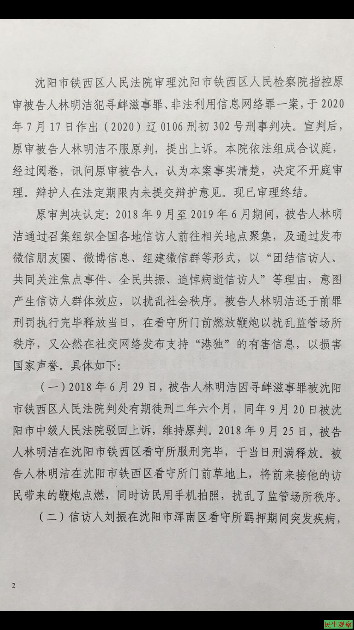 辽宁沈阳市林明洁,林明华兄弟因上访获罪,林明华一审被判3年,林明洁被判5年,二审维持原判。