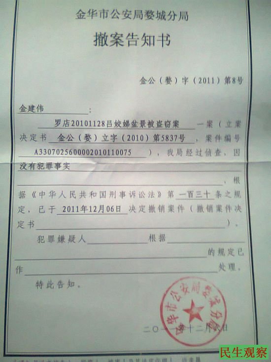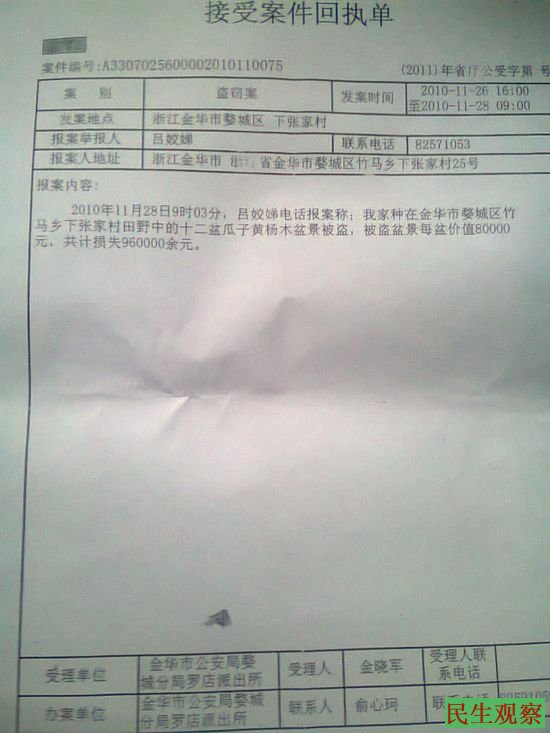 由于2010年11月28日,家人发现12盆盆景全没有了,我在外面就叫我妈打110报案,罗店派出所民警到现场后,立为盗窃案,①电视台也来现场采访过,在金华百姓零距离栏目报道过(有视频