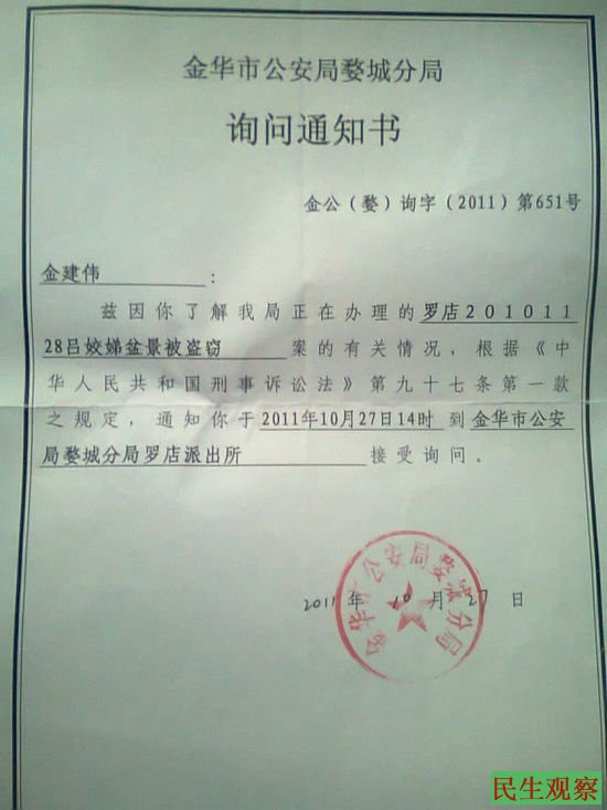 有一次我在婺城分局四楼要跳楼。乡政府记委书记方彩文闻讯赶来,罗店派出所所长金子根也赶来。我几次到婺城公安分局上访,过了3个多月到法制科反应要求下才做我当事人的笔录,应该及时取证。到市公安局上访一直都没解决。后来市公安毛局长接访我后,给罗店所所长金子根停职查办此案,在这其间金子根把这案子材料做实,我委托老律师把材料全都看过,金子根也让我看过,结果都不是事实。要求跟我所有录音证据跟他们的笔录材料来对,他们不敢来对,我觉得全都不一致。
