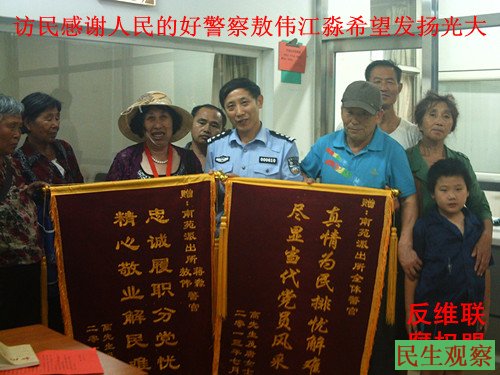 在场的访民全都被感动的说;这才真正是人民的好警察。事后高明科去南苑派出所查到两位民警的姓名:敖伟、蒋淼。2012年7月1日,唐秀云电话说:约我上午9点钟去北京南站相会一同去北京市公安局送锦旗。我带着孤儿胖胖到南站时并没有看到唐秀云。我给唐秀云打电话问她在哪里?她说:马上到南站了。我们在给警察写个表扬信去了多家打字店都说:表扬警察不给打。