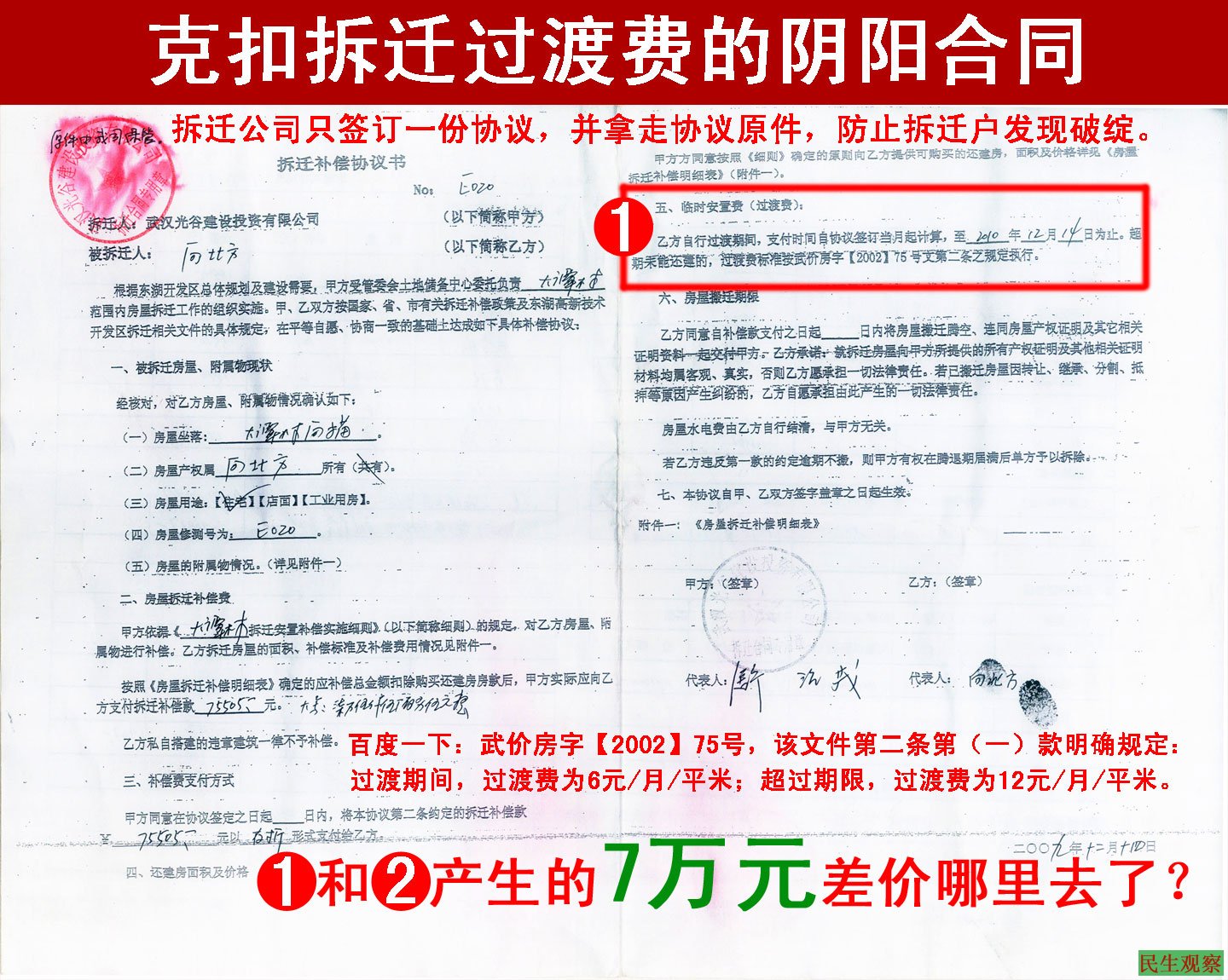 @武汉拆500平米只赔80平米:【微博举报二】拆迁“阴阳合同”明确约定:按①——武价房字【2002】75号计算过渡费,实际按②——120元/ 人/月赔偿。两种计算方法产生了巨大差价:拆1户250平米的房子被拆迁公司 www.ggjstz.com 克扣7万。流芳镇成千上万户,总共被克扣了多少?保守估算,至少4个亿,这4个亿拆迁过渡费哪里去了?@车延高