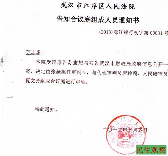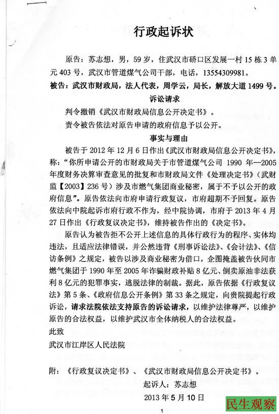 湖北省武汉市管道煤气公司在职干部苏志想,状告武汉市财政局不依法公开信息一案昨日(7月10日)上午在江岸区人民法院公开开庭审理了这一行政案件。参加旁听人员多达数拾人,经过了一系列的严格安检进入法庭。开庭后公民代理人:张学逊、邹立衡,当庭列举了武汉燃气集团,伙同武汉巿财政局诈骗国家财政䃼贴8亿元和倒卖国家原油非法获利8亿元的大量违法、犯罪事实。通过举证、执证后案件焦点很明确:“该信息应不应该公开。”被告答辨称:涉及商业秘密不应公开。原告代理人的意见是完全应当公开。其事实、理由、依据如下: