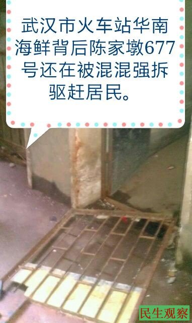 2013年7月21日下午5点半钟,发生在武汉市江汉区陈家墩677号,由唐家墩村拆迁专班组织5人的社会闲散人员暴力拆门案件,如此光天化日下置国家的法律不顾,在受害人还没有达成拆迁协议的前提下,采取非正常手段迫使受害人搬迁。在社会主义法制国家里已见怪不怪了,他们的行为是法律所不允许的,为什么会出现这种现象呢?拆迁房屋要与市场接轨不然让老百姓买得起房屋,我们的房屋是政府发的合法居住证明,是私有财产,为什么采取这种不要脸的手段巧取豪夺,这让我不得不认为是政府官员官商勾结,愚弄人民,这种非正常拆迁,只能拆掉老百姓对政府的信任,这是一种对法律的践踏。拆掉的是这个国家和政府的基石,最后让老百姓对我们的党和政府失去信任,增加社会不安定的因素。我强烈要求我们的政府认识问题的严重性,追究相关人员的法律责任,让这个国家的法律能走上正常轨道上来。