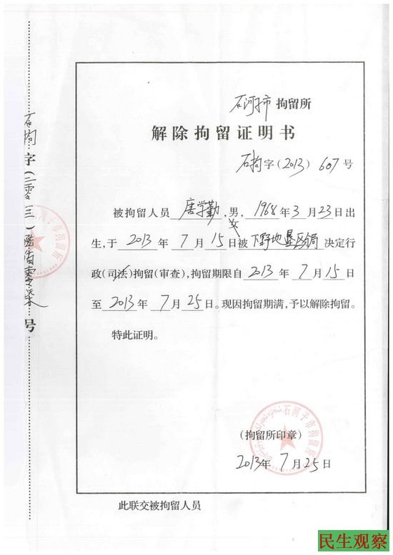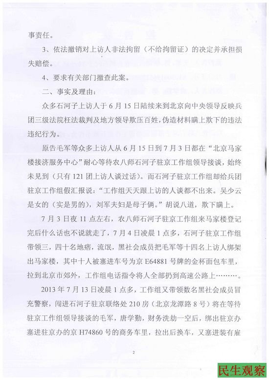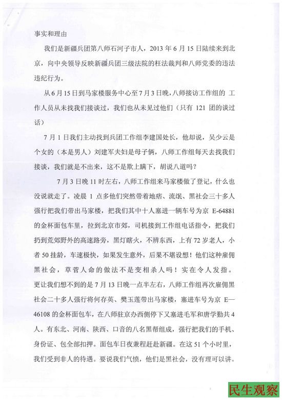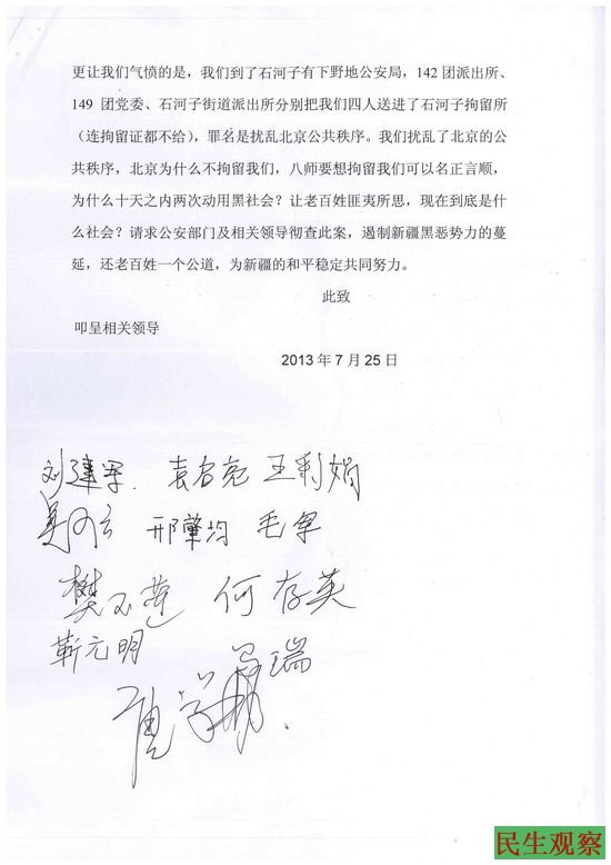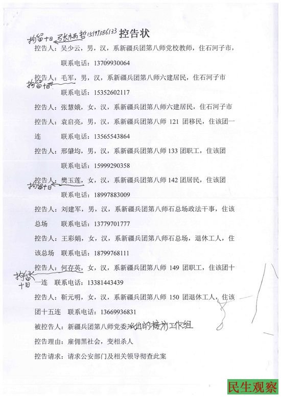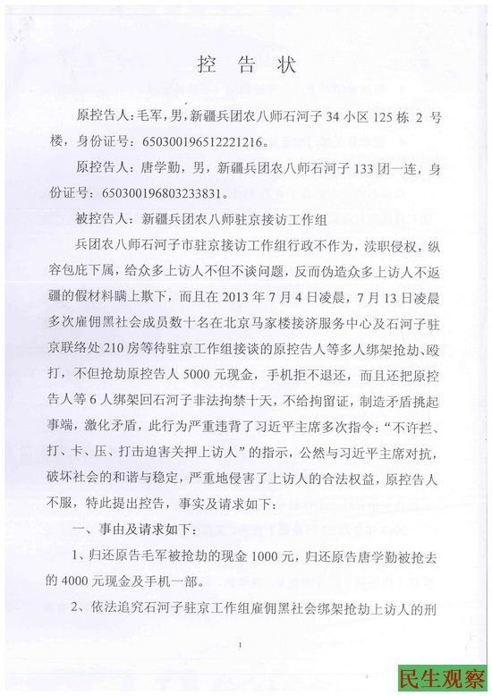 新疆唐学勤等一批访民就非法拘留、拘禁的控告状