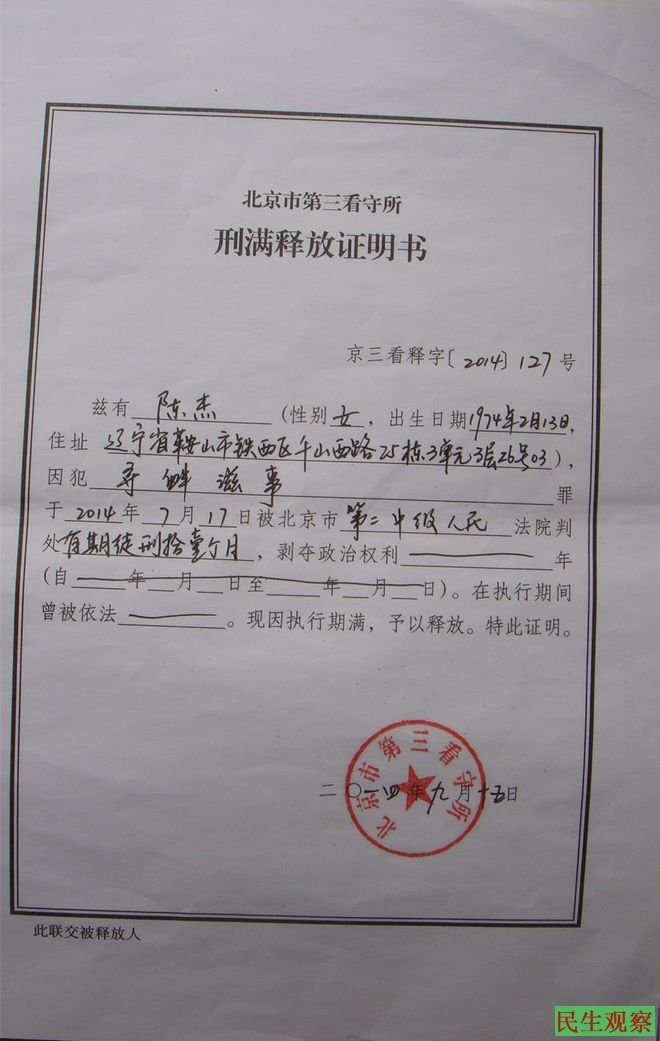你好,我是辽宁鞍山的陈杰,我们在2013年10月16日在北京天安门撒材料被以寻衅滋事罪判刑10个月,我没有撒材料不愿意认罪就被判刑11个月。