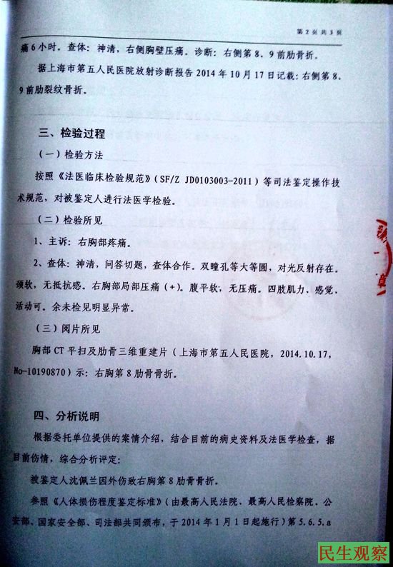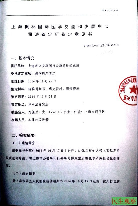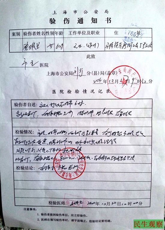 2014年10月17日,我遭上海闵行区马桥镇派出所警察王尉、马桥镇信访办工作人员张漪等七八人绑架、殴打,导致第八、九两根肋骨骨折。