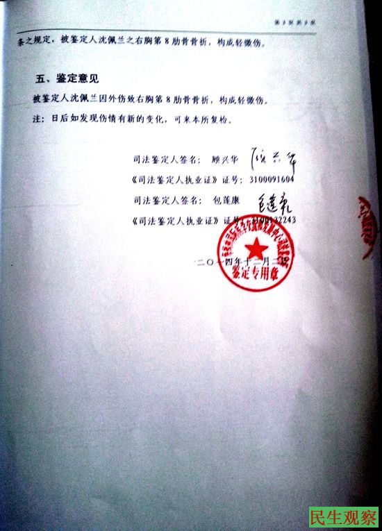 10月17日早晨5点刚过,我准备外出,被在楼道口守候已久的马桥镇派出所未穿警服的警察王尉、马桥镇信访办工作人员张漪等七八人拦截不让外出,被我拒绝,他们这伙人一涌而上拳打脚踢,暴力将我硬按进汽车,他们几个人使劲摁住我的手脚,还有一个掐住我的头颈,整个人被扑倒架空在汽车椅子边上不能动弹,把我肋骨打成骨折,司法鉴定为轻微伤。