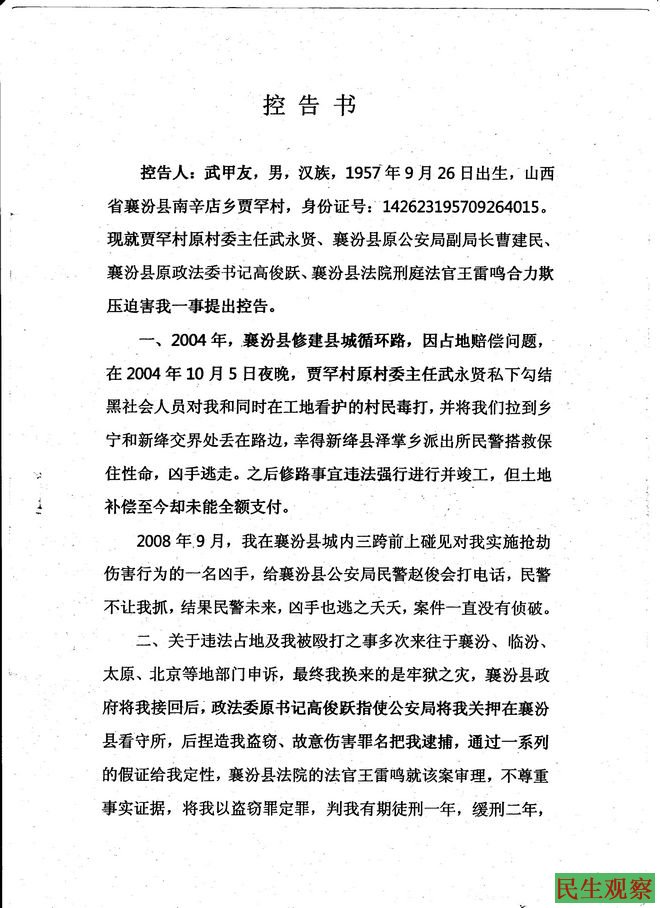 山西省襄汾县农民武甲友就十年上访遭殴打判刑的控告书