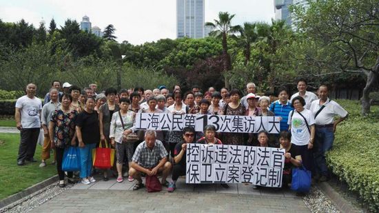 此外,上海数十访民今天也统一行动,他们到上海市中级人民法院投诉区法院违法办案或不予立案的罪行,并有5名代表进去接谈,但他们得到的答复是,你们这么做没用。随后他们在法院的院内张打“控诉违法法官保卫立案登记制”的横幅抗议,并到市人大提出控告。据悉这是他们第十三次控告法院的集体访。