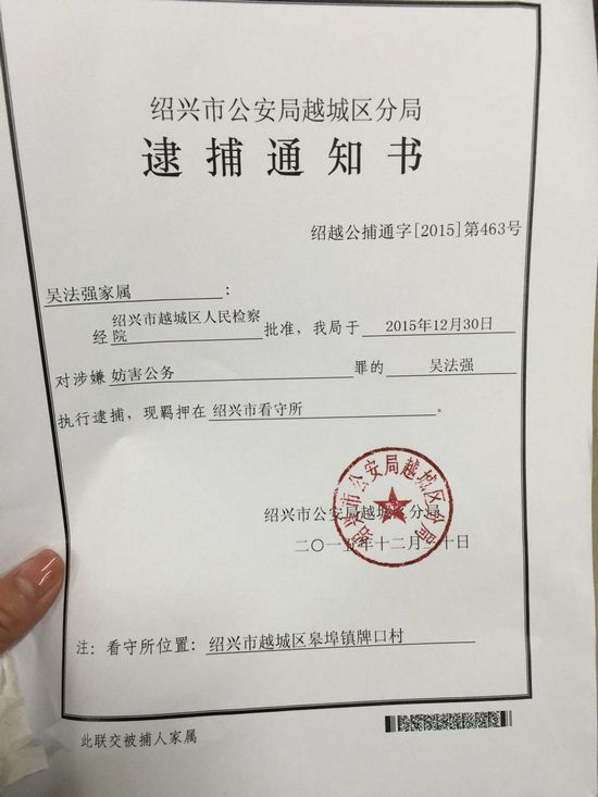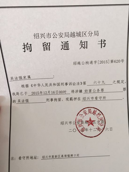2015年2月28日越城区北海派出所将其传唤、羁押,执行2015年12月16日越城区公安分局以涉嫌妨碍公务罪对吴法强做出的刑事拘留决定。