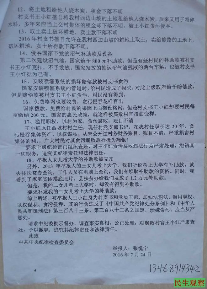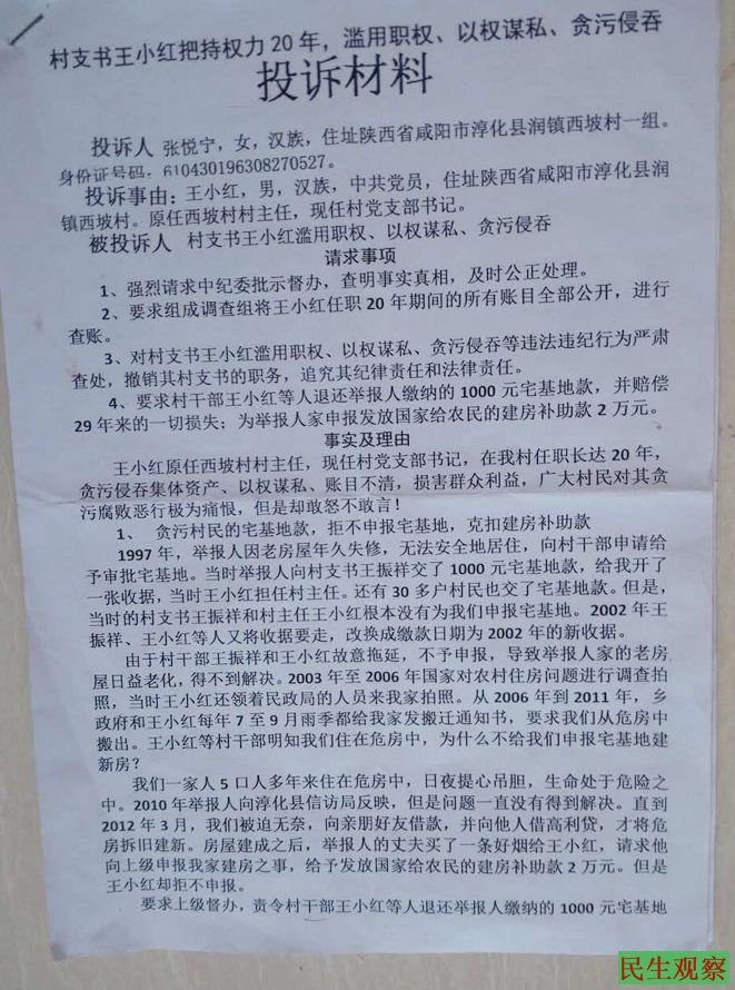陕西省淳化县西坡村民张悦宁对村支书的投诉书