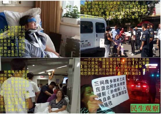 2016年 8月24日,北京市朝阳区三间房孙晓丽先被北京三间房乡政府的贾臣和三间房乡派出所警察刘争,开车撞伤腿之后!没有任何手续强行把她带三间房派出所称要拘留她,还不给她饭吃和就医。25日孙晓丽要到北京市公安局和政府告其违法行为,有十多名警察非法限制其人身自由,将其非法拘禁在三间房圣龙祥别野的1103房间不让离开!期间三间房乡派出所教导员张浩和付所长杜文彬,还对“ 不听话”的她脸上喷的辣椒水、又用一米多长的铁的大警棍打了好几下!在警车上政委张浩跪在车的椅子上压着孙晓丽双手!警察王博还用手狠狠的摁着颈隧已严重损伤的孙晓丽脖子上,完全不顾她的死活。