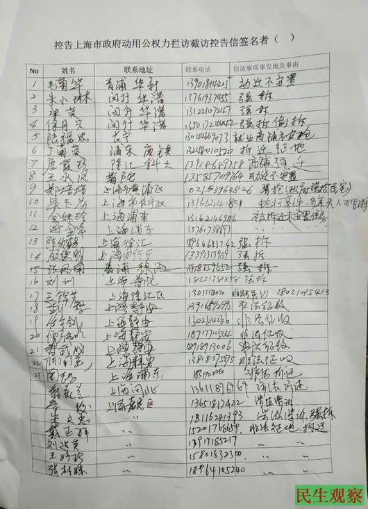 据悉,仅今年4月,上海大批访民就因到国家信访局上访被行政拘留。其中被拘留人员有上海杨浦区访民陈宝良、李建勇、虹口区谢穗好、叶根生、浦东新区吴党英、徐汇区赵迪迪、上海嘉定区高雪坤、南汇区谢云达等人。