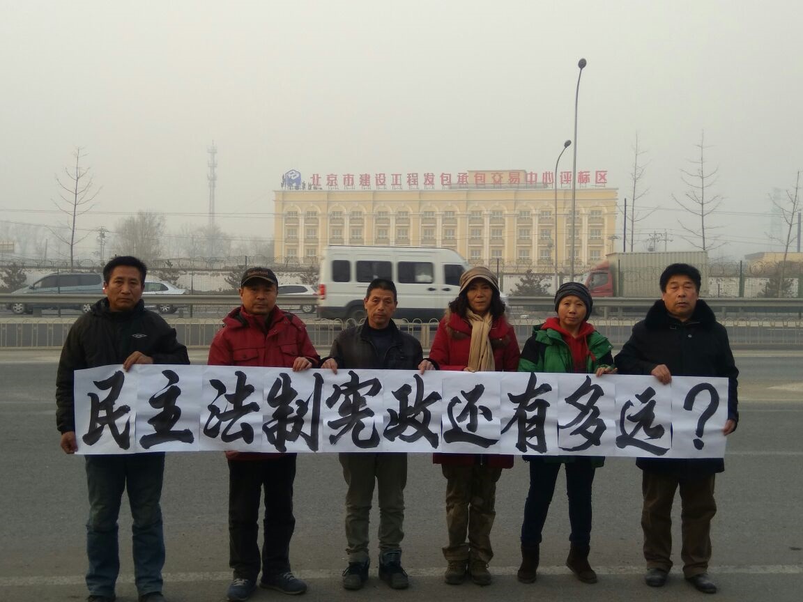 在京访民打横幅声援维权人士 要求民主宪政 |