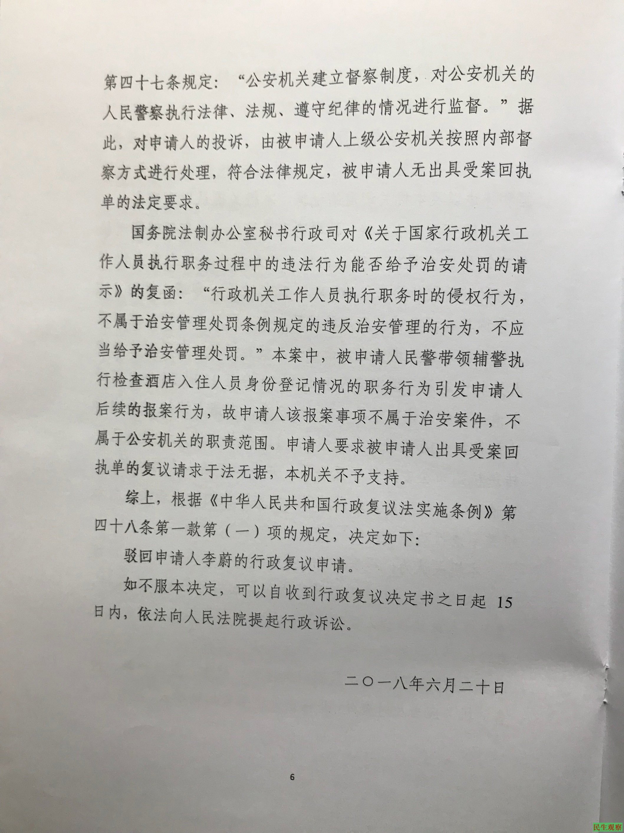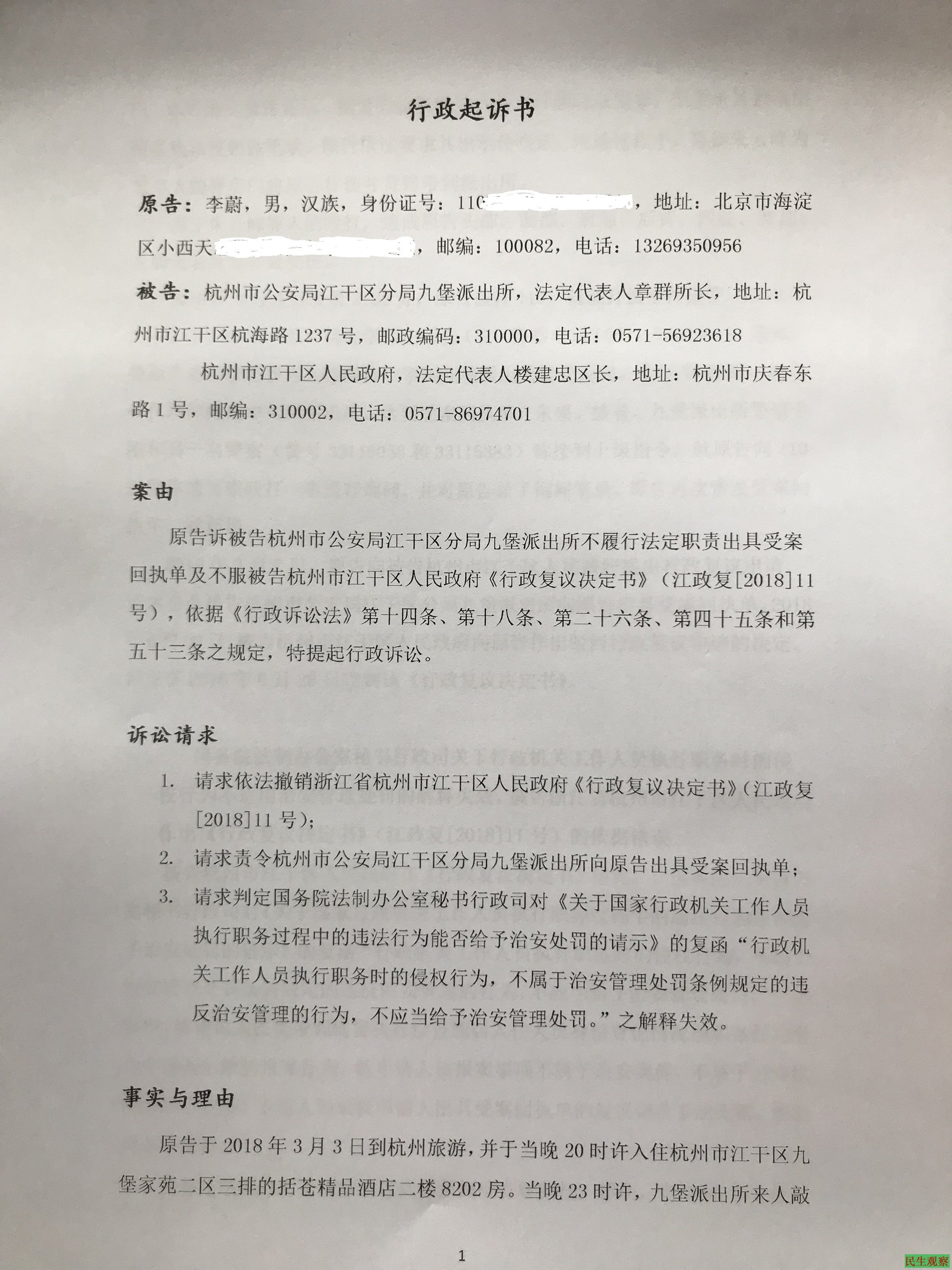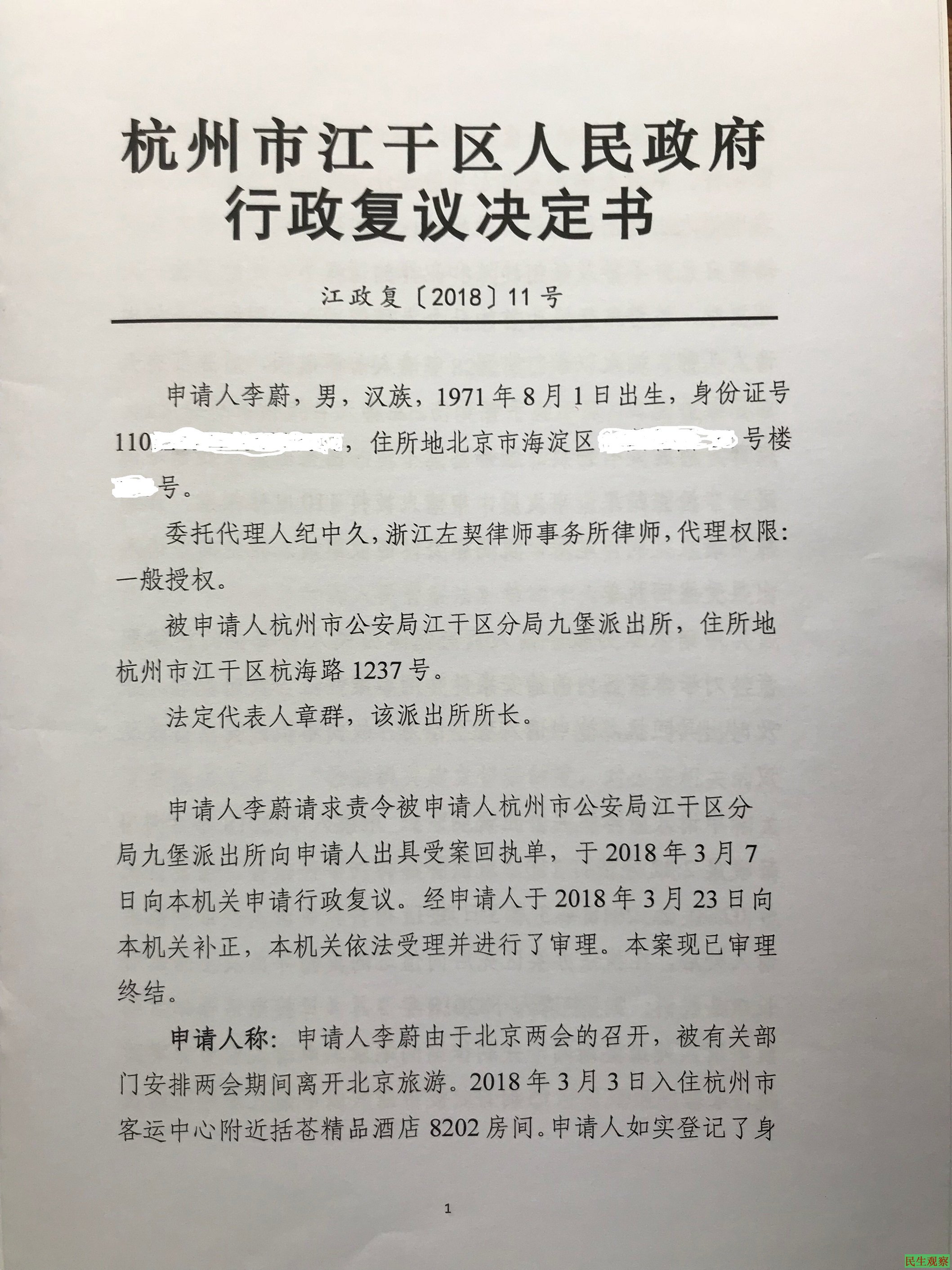 李蔚诉杭州九堡派出所不出具受案回执单和不服杭州江干区人民政府行政复议决定——李蔚在杭州被警察非法打伤维权通报(2018年7月2日)