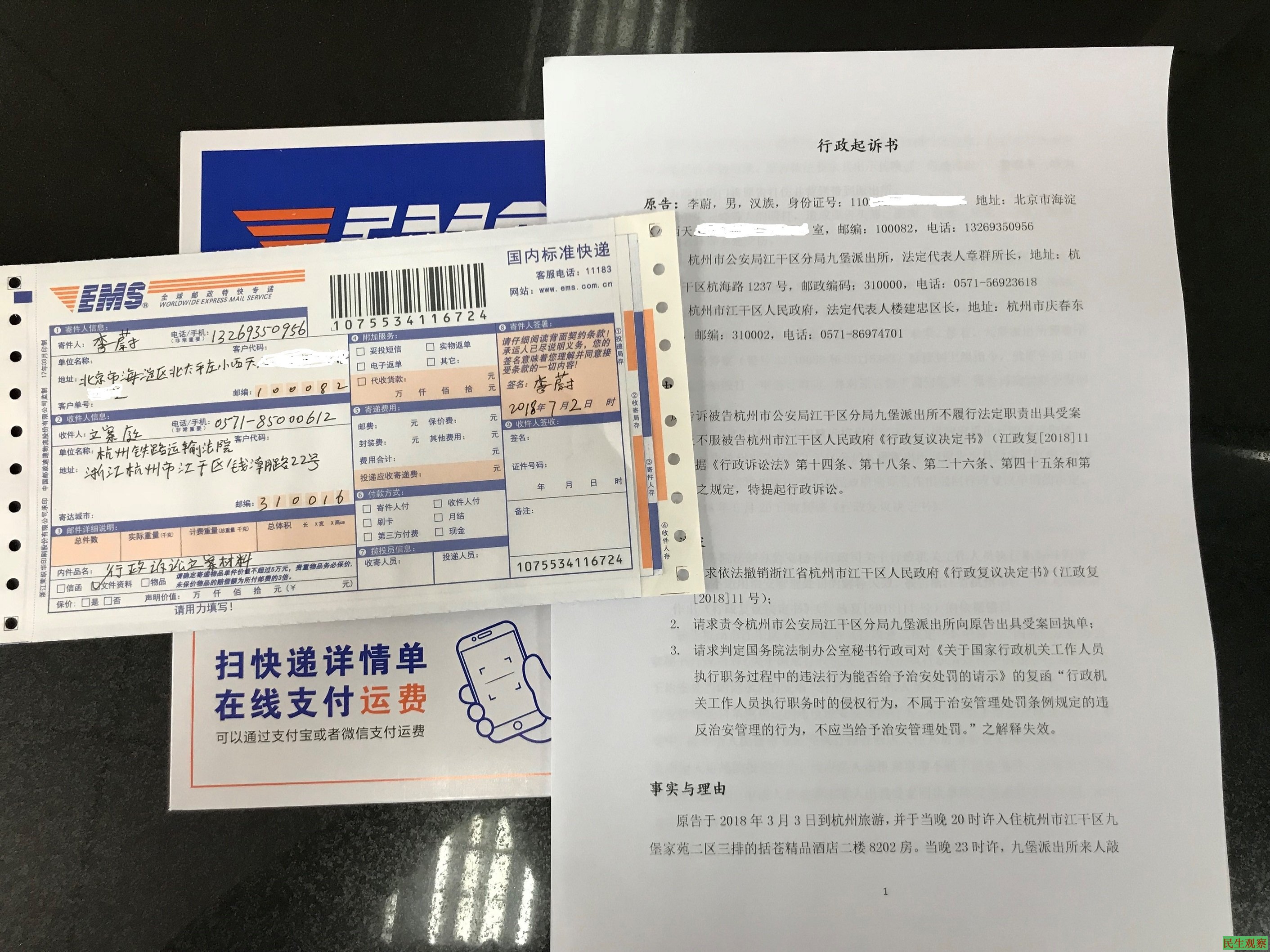 2018年7月2日,李蔚通过中国邮政特快专递向杭州铁路交通运输法院邮寄行政起诉书,诉杭州市公安局江干区分局九堡派出所不履行法定职责出具受案回执单及不服杭州市江干区人民政府驳回李蔚行政复议请求的《行政复议决定书》(江政复[2018]11号)。根据《行政诉讼法》,李蔚将杭州市公安局江干区分局九堡派出所和杭州市江干区人民政府列为共同被告。